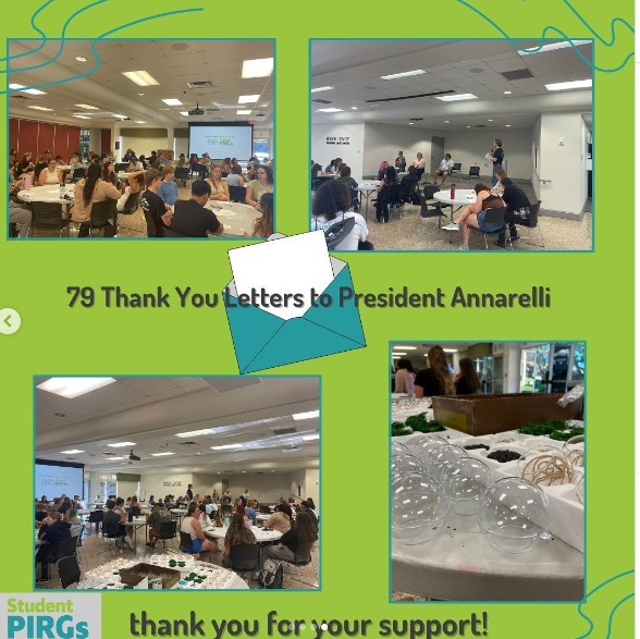 In the spring we hosted our biggest on campus event to date with our Climate Convo event. We had 93 students attend the event and participated in building terrariums. We received 44 signed petitions for our 100% campaign, and received 79 written thank you letters to President Annarelli! We would like to thank our volunteers and interns who were involved in the planning and execution of this event as well as our guest speakers! Thank you Professor Flower, Professor Gowans, and Professor Cribbs!